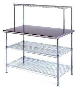![]() Consists of: Stainless Steel Table Top (2) - 54" rear chrome posts (2) - 33" front chrome posts (2) - 21" front chrome posts of overshelf (1) - 14"wide chrome wire overshelf (2) - Chrome wire undershelves* |